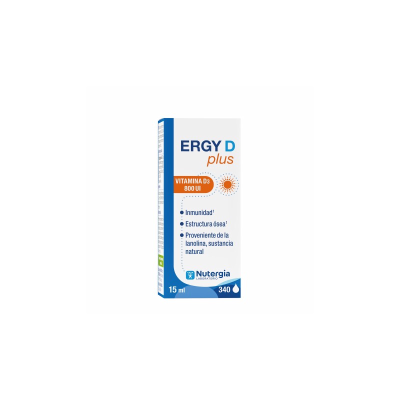 ERGY D Plus es un complemento alimenticio de Nutergia formulado a base de vitamina D3 (colecalciferol) de alta biodisponibilidad, disuelta en aceite vegetal para una óptima absorción. Está indicado para apoyar el sistema inmunitario, el mantenimiento de huesos y dientes, y la función muscular.